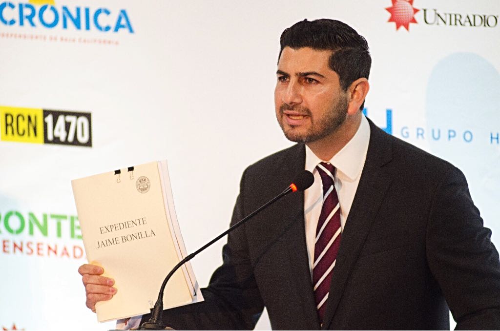 El candidato al senado por el PRI sostenía un folder con documentos que dijo cuestionará a Bonilla candidato de Morena en el debate del 7 de junio, ya que se ha negado a participar en todos los foros y debates organizados por empresarios, organismos de la sociedad civil y medios de comunicación.
