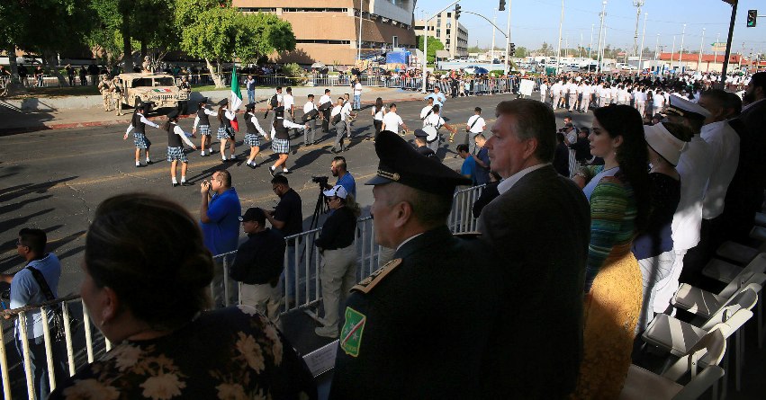 Al continuar con los eventos por el 208 Aniversario de la Independencia de México, el Gobernador Francisco Vega de Lamadrid, acompañado de su esposa, señora Brenda Ruacho de Vega, del Comandante de la II Región Militar, General de División D.E.M. Gabriel García Rincón y el Comandante de la II Región Naval, Almirante C.G. D.E.N. Jorge Luis Cruz Ballado, encabezó el acto protocolario de honores a la bandera, para después presenciar el desfile cívico militar.