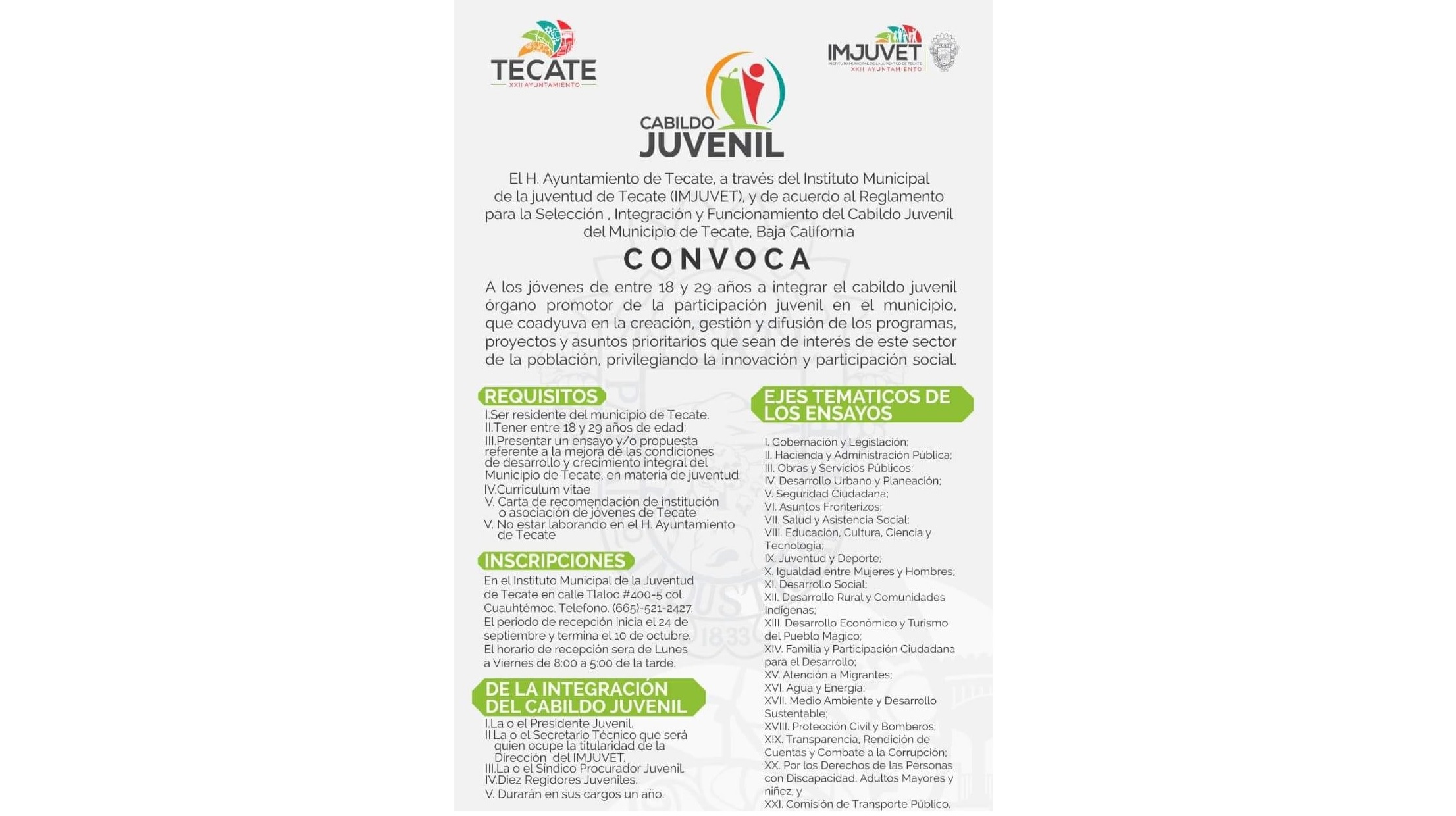El Gobierno Municipal de Tecate a través del Instituto Municipal de la Juventud (IMJUVET), convoca a jóvenes de entre 18 y 29 años a integrar el primer Cabildo Juvenil de Tecate, con el cual se motiva a la juventud a participar de manera activa en la vida social y política de Tecate.