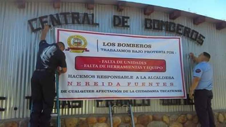 Varios integrantes del cuerpo municipal de bomberos y miembros de esta organización colocaron una lona en la base principal de la agrupación donde alegan una supuesta falta de equipo, herramientas y unidades.
