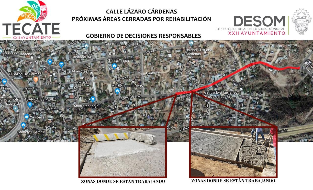 Como parte del plan de trabajo de la presente administración enfocado en el mejoramiento de calles y avenidas de las diversas zonas de la ciudad, el Gobierno Municipal de Tecate anuncia el cierre parcial del acceso principal de la calle Lázaro Cárdenas a partir del lunes 22 de julio y hasta que los trabajos de rehabilitación concluyan.