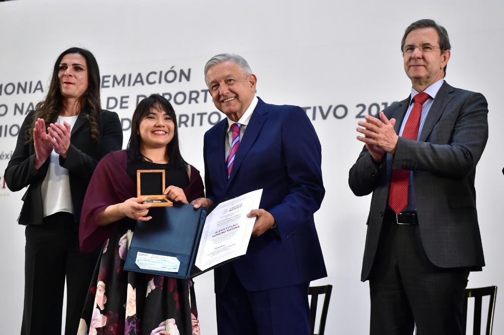 En la ceremonia en el Palacio Nacional, la clasificada a Juegos Olímpicos de Tokio 2020 y tercer lugar mundial en Doha 2018, recibió de manos de López Obrador el máximo premio nacional al deportista amateur, siendo una presea, diploma y un estímulo en efectivo.