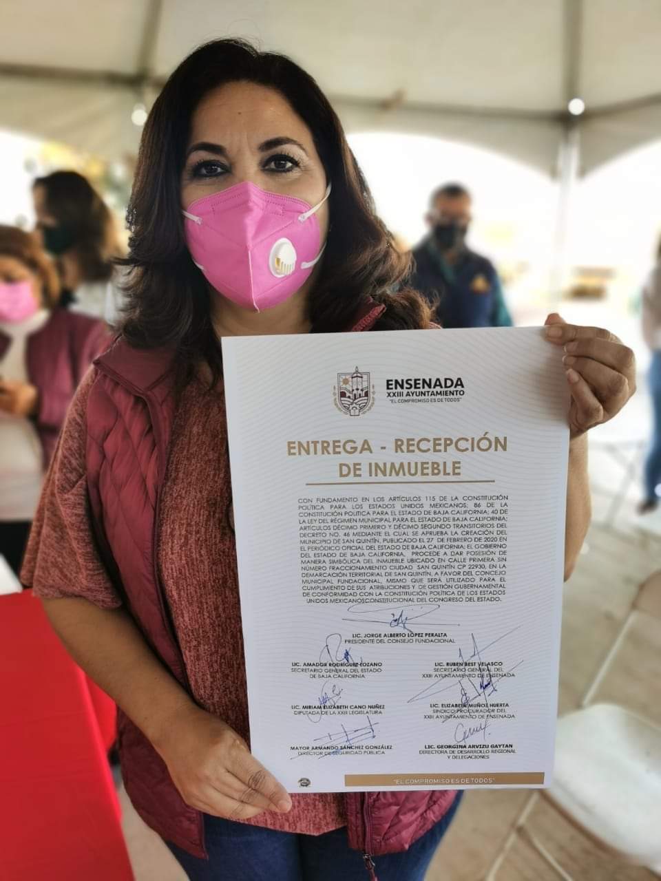 La diputada de la XXIII Legislatura de Baja California, Miriam Elizabeth Cano Núñez, participó activamente en la entrega física de las instalaciones, mando policiaco y bienes a los integrantes del Concejo Fundacional del Sexto Municipio de Baja California, ante la presencia del Secretario General de Gobierno, Amador Rodríguez Lozano, en representación del Gobernador Jaime Bonilla.
