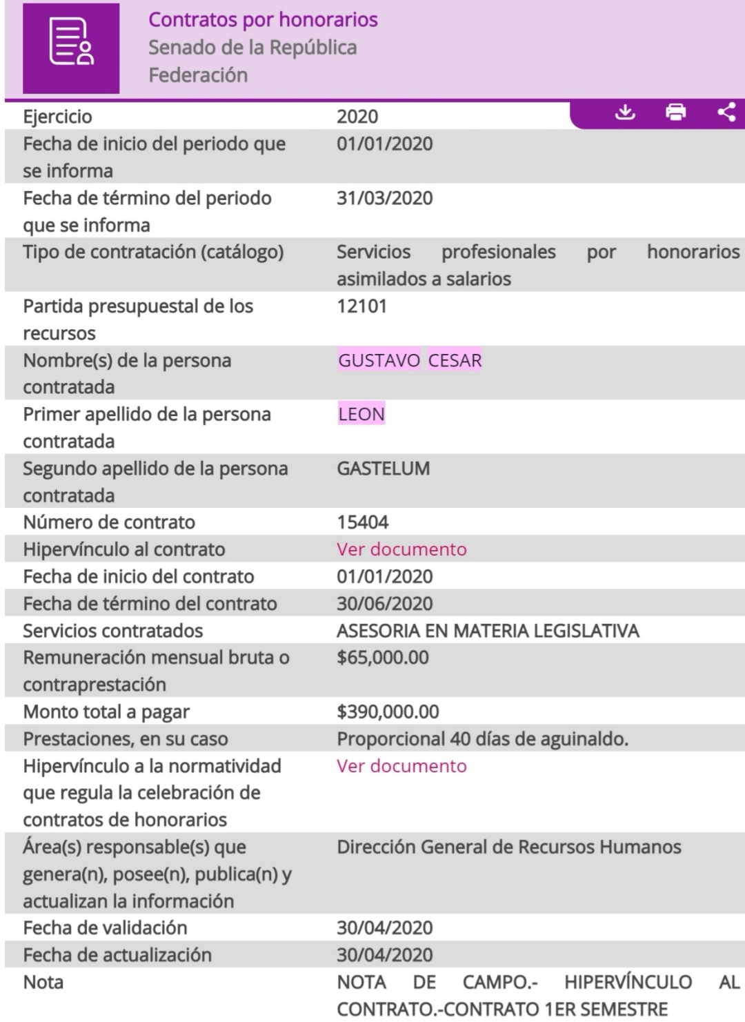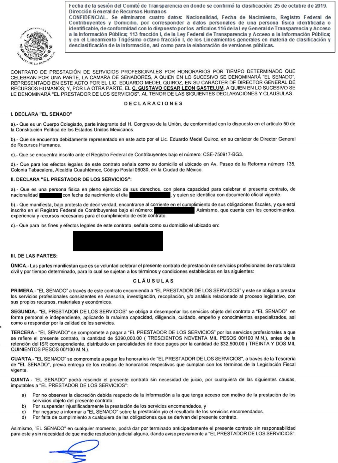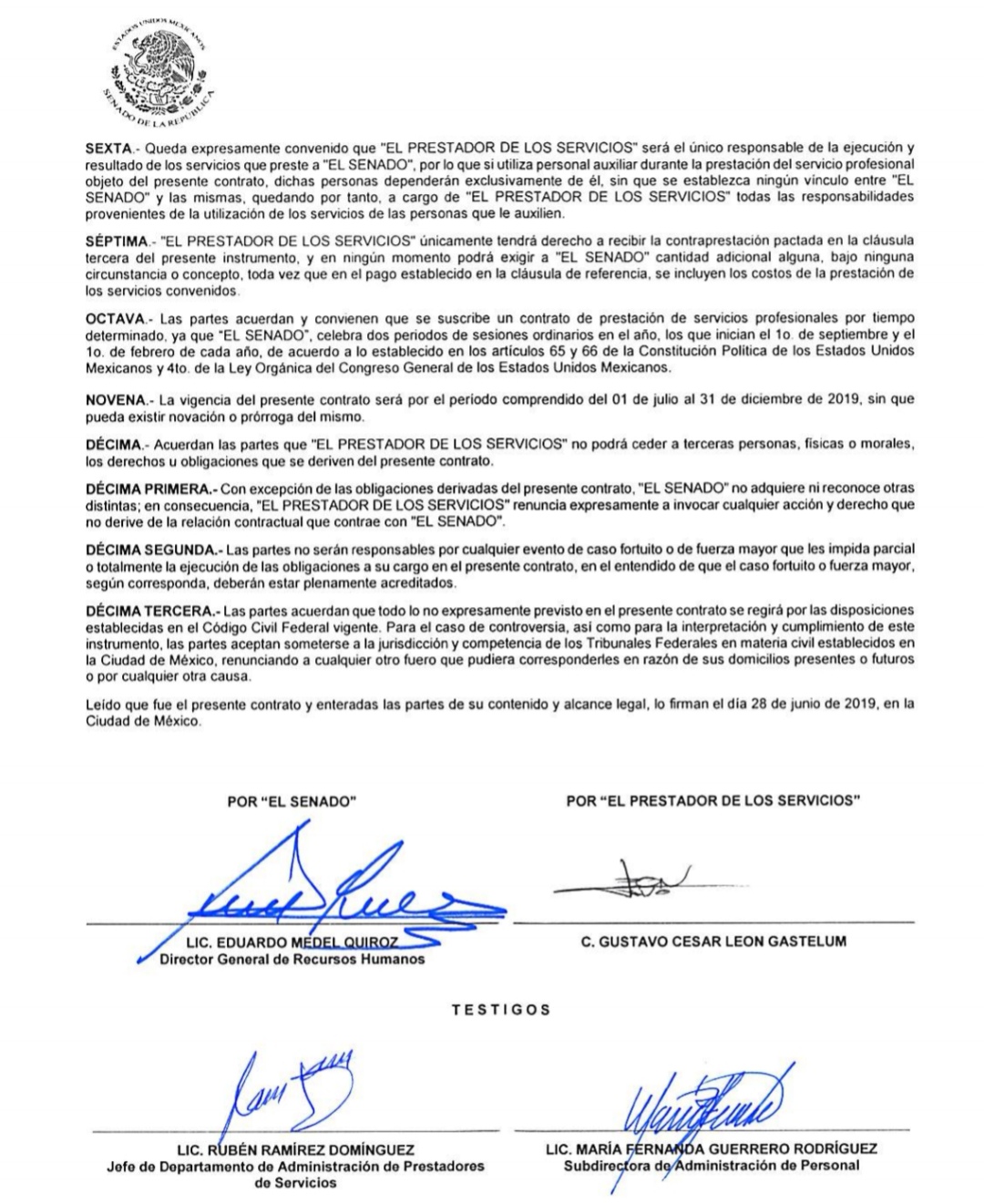 Los contratos se establecieron desde el 28 de junio de 2019 entre el Senado de la República representado por el jefe de recursos humanos, Lic. Eduardo Medel Quiróz y el hermano de la senadora León, Gustavo César León Gastelum por un monto de $390,000.00 pesos moneda nacional derivado de los servicios de asesoría legislativa que ofrece para Alejandra León y al Senado de la República.