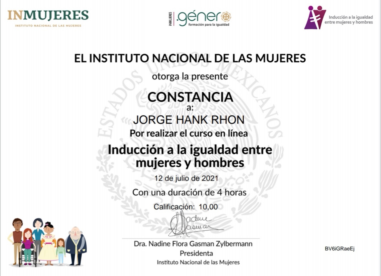 Adicionalmente a este ordenamiento, el Ing. Hank Rhon tomó un curso en línea con duración de cuatro horas denominado Introducción a la igualdad entre mujeres y hombres, que emitió una constancia avalada por el Instituto Nacional de las Mujeres, firmada por su titular, la doctora Nadine Flora Gasman Zylbermann.