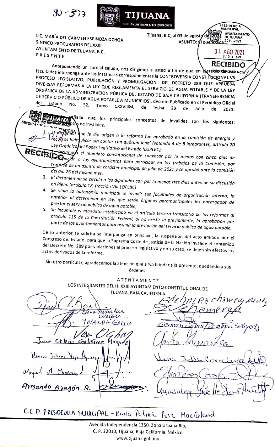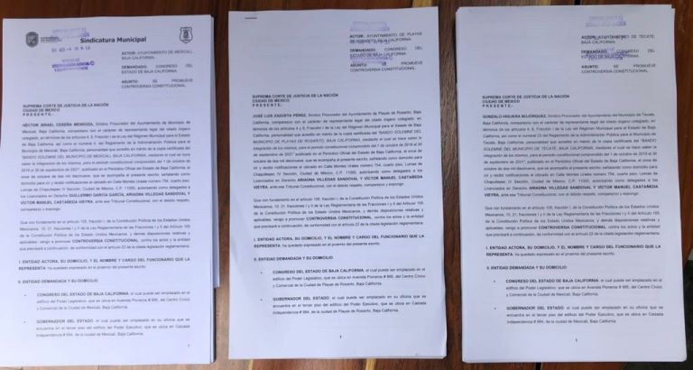 Recientemente, la mayoría de los ediles de Ensenada emitieron un documento a la síndica Elizabeth Muñoz Huerta, para que esta presentara una controversia constitucional, y lo mismo ocurrió en Tijuana, cuando 12 regidores presentaron un escrito similar a la síndica de Tijuana, María del Carmen Espinoza, para que se pronuncien al igual que dichos tres municipios.