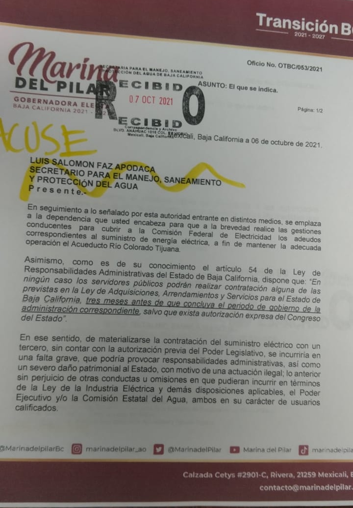 Baja California.- A través de una carta firmada por el coordinador General de las Comisiones de Enlace de las autoridades entrantes en B.C, Mtro. Catalino Zavala, pide al actual gobernador del Estado Jaime Bonilla pagar la deuda de 163 millones de pesos por el consumo del periodo de agosto y septiembre del 2021.