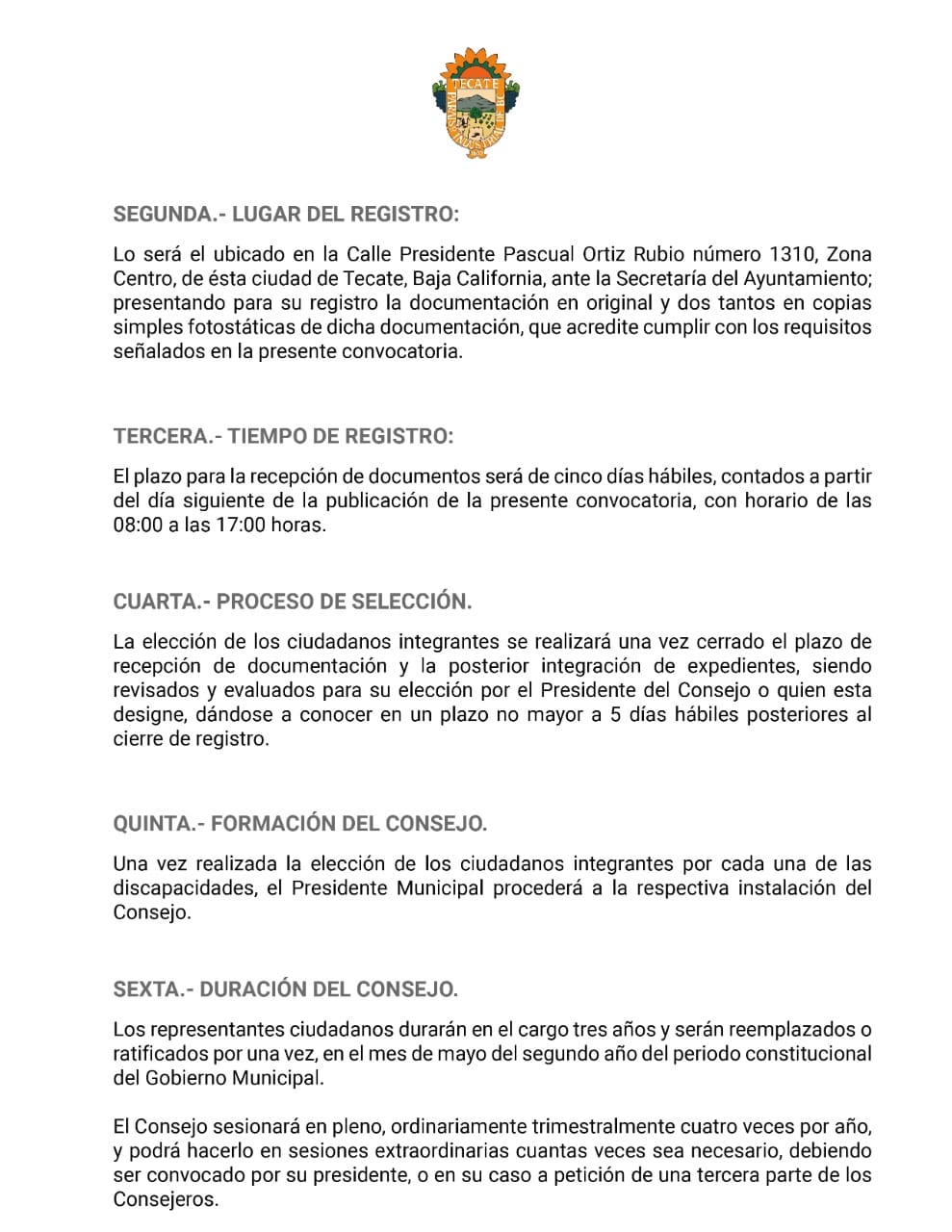 Tecate, Baja California a 10 de marzo de 2022.- El Gobierno de Tecate a través de la Secretaría del Ayuntamiento, convoca a ciudadanos que realicen actividades en beneficio de las personas con discapacidad y que representen a cada una de ellas (motriz, visual, auditiva, intelectual y múltiple), a fin de conformar el “Consejo Municipal para los Derechos de Personas con Discapacidad” del municipio de Tecate.