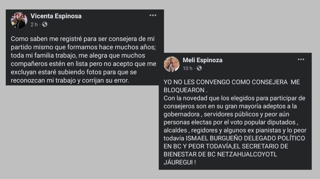 Por otra parte, Meli Espinoza, quien fuera sindico de Tijuana durante el gobierno de Arturo González Cruz, criticó que la mayoría de los que permanecieron en el listado para conformar la consejería del partido, sean adeptos a la gobernadora, según escribió.