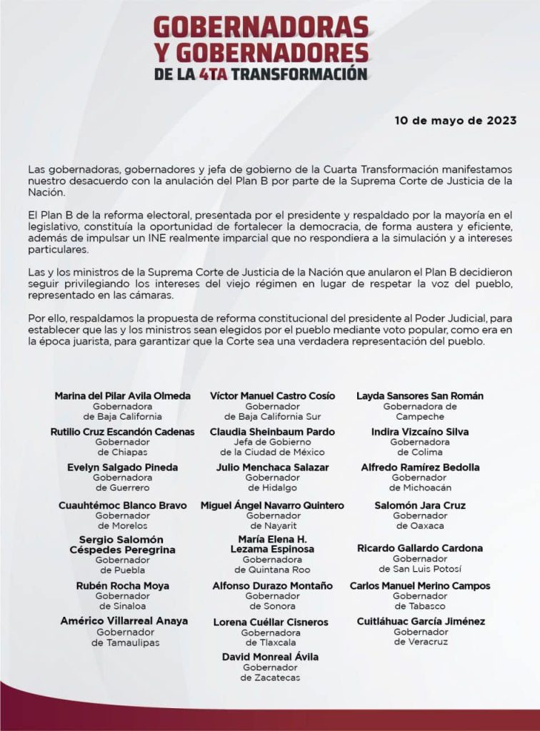 En dicho comunicado también firmó la gobernadora de Baja California, Marina del Pilar Ávila Olmeda, además de otras gobernadoras y gobernadores de Morena, siendo un total de 22 representantes de ese partido en México.