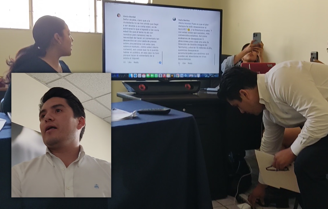 Mientras la directora de la dependencia, Elena Dueñas, revisaba comentarios en redes del alcalde Darío Benítez, un sujeto que identificó como Frank Ortiz, quien es director Jurídico del gobierno municipal, apagó los aparatos donde se realizaba la conferencia y trató de sacar a los presentes.