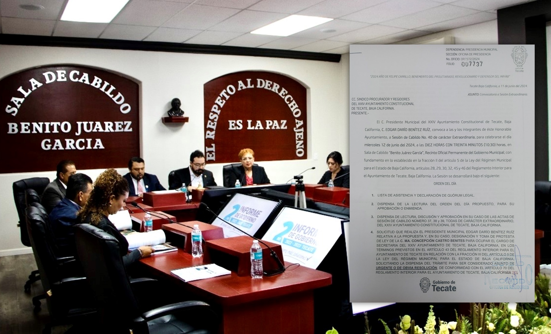 TECATE.- El alcalde Darío Benítez Ruiz, nuevamente envió la propuesta al Cabildo de postular a la licenciada María Concepción Castro Benítez como secretaria del Ayuntamiento de Tecate.
