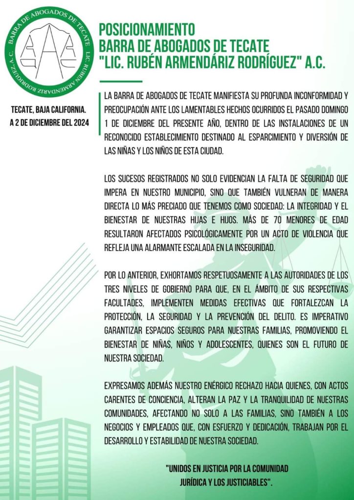 TECATE.- Luego de los incidentes violentos que se registraron el pasado domingo 01 de diciembre en un establecimiento de la ciudad, la barra de abogado “Lic. Rubén Armendáriz Rodríguez A.C.”, exhortó a las autoridades a reforzar la seguridad.
